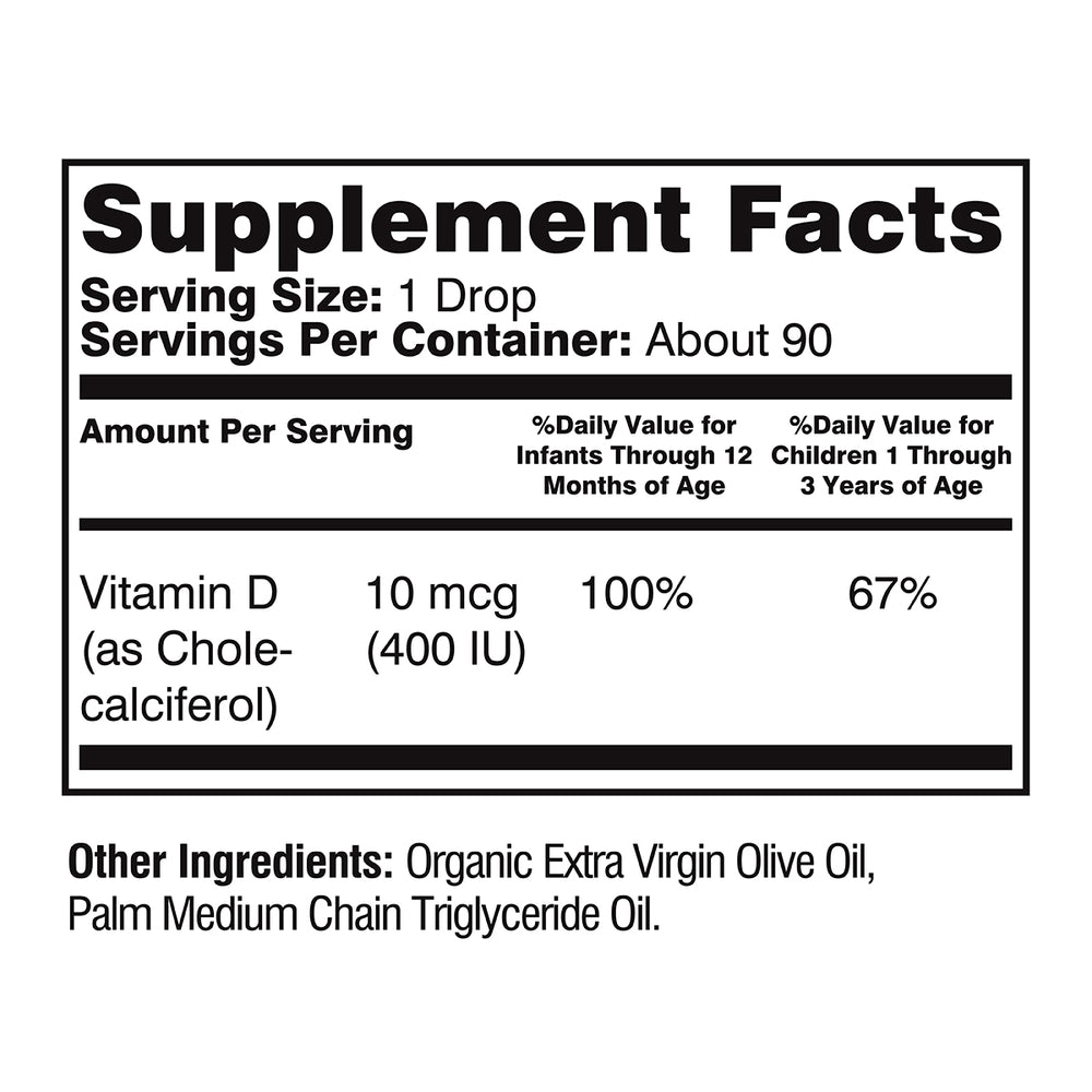 The American Academy of Pediatrics recommends that your little one gets 400IU/10mcg of Vitamin D daily, which is what one daily drop of Wellements Organic Vitamin D Drops is – providing all that your breastfed baby needs to get the proper amount. Do not exceed this dosage.