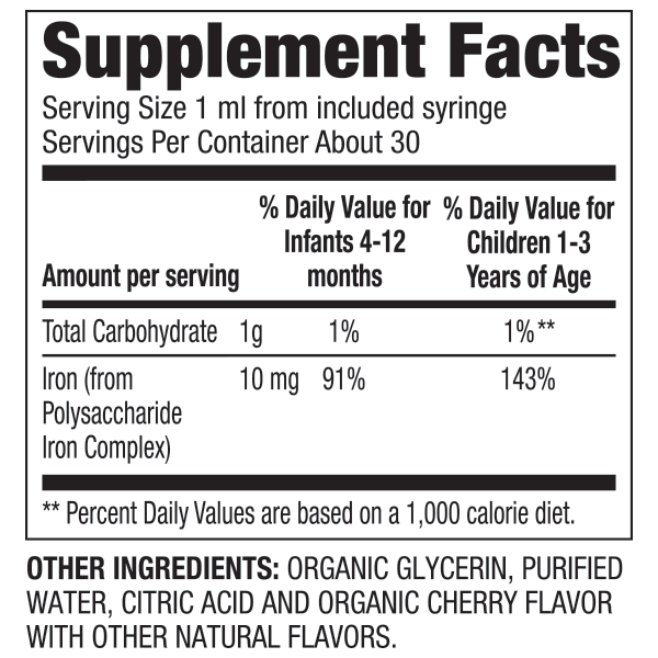 Shake the bottle well before each use. Fill the dispenser with Organic Iron Drops to the 1 ml line. Dispense the liquid slowly toward the inner cheek of your baby’s mouth. Wash and dry the dispenser thoroughly after each use. Make sure to rinse the mouth after taking and for toddlers with teeth rinse and/or brush their teeth after taking.