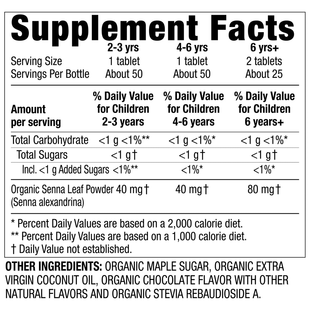 Our chewable laxative tablet is formulated with organic Senna, an ingredient that’s FDA permitted and science-backed as effective for constipation. Chocolate flavored Children’s Laxative works to trigger muscle contractions in the intestines to help move stool along naturally for quick relief.